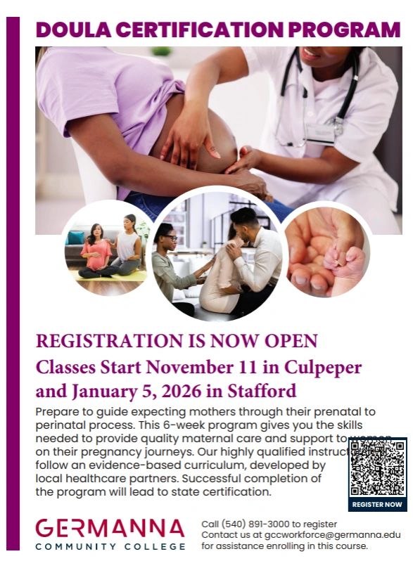 Germanna Community College is offering a Doula class in Stafford Virginia. Scan the QR code or click "FIND OUT MORE" to register or for more information.